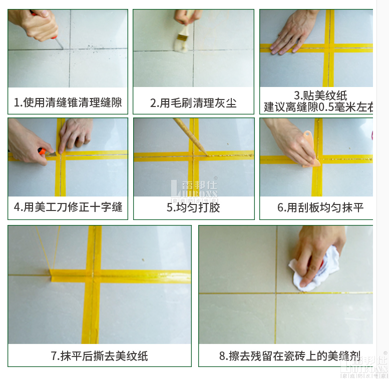 材料要選購綠色環(huán)保、性能穩(wěn)定的美縫產(chǎn)品,如不易收縮、開裂、耐磨、耐酸堿、耐擦洗,容易擦洗,不易藏污垢。雷邦仕美瓷膠就具備這些優(yōu)良的性能,且適用于廚房、衛(wèi)生間等多個(gè)部位的防水施工,即使是在長期使用過程中也能夠保持瓷一般的光澤,耐污能力和防霉防污能力也很強(qiáng)。